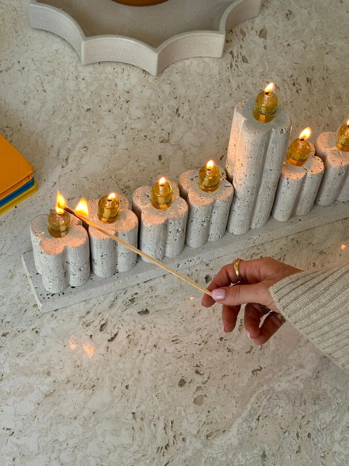 Symbole de foi, de famille et de continuite, la Hanoukiah célèbre la lumière qui traverse le temps. Chaque flamme rappelle la force de la foi, la transmission et la beauté d'éclairer le monde à notre tour. Cette création, Flora Hanoukiah, toute en travertin, rend hommage à la lumière qui unit la matière et l'esprit.